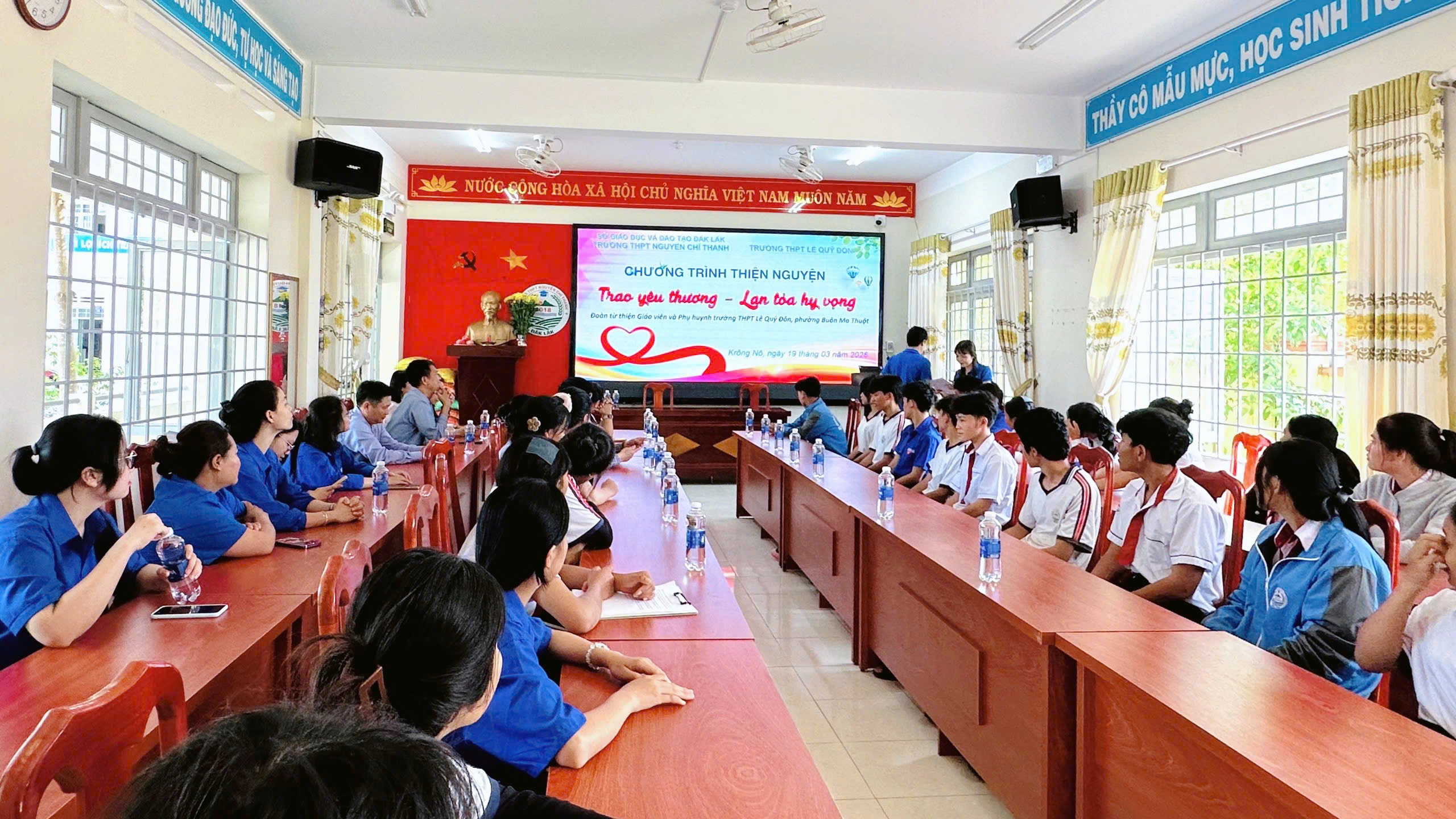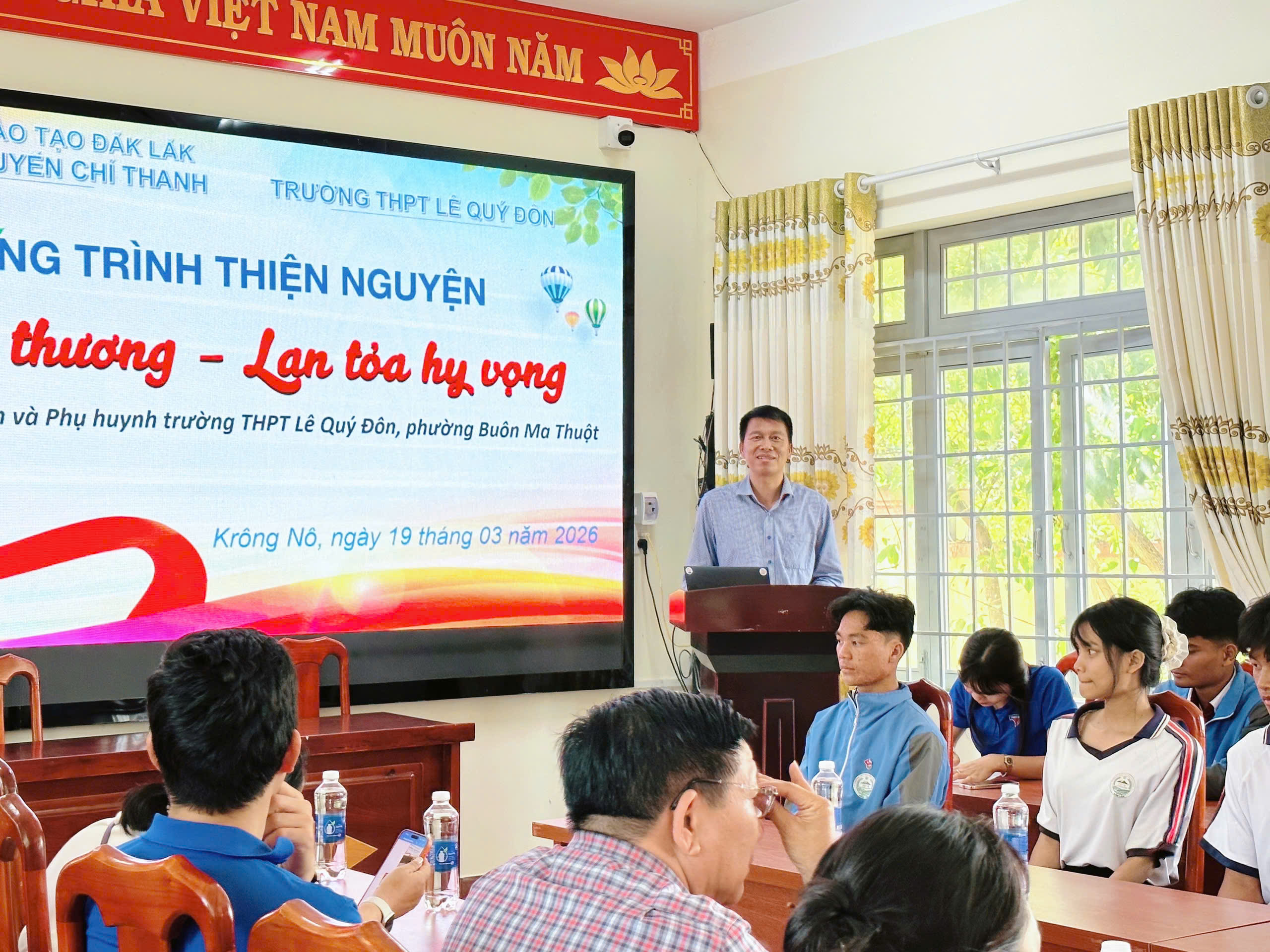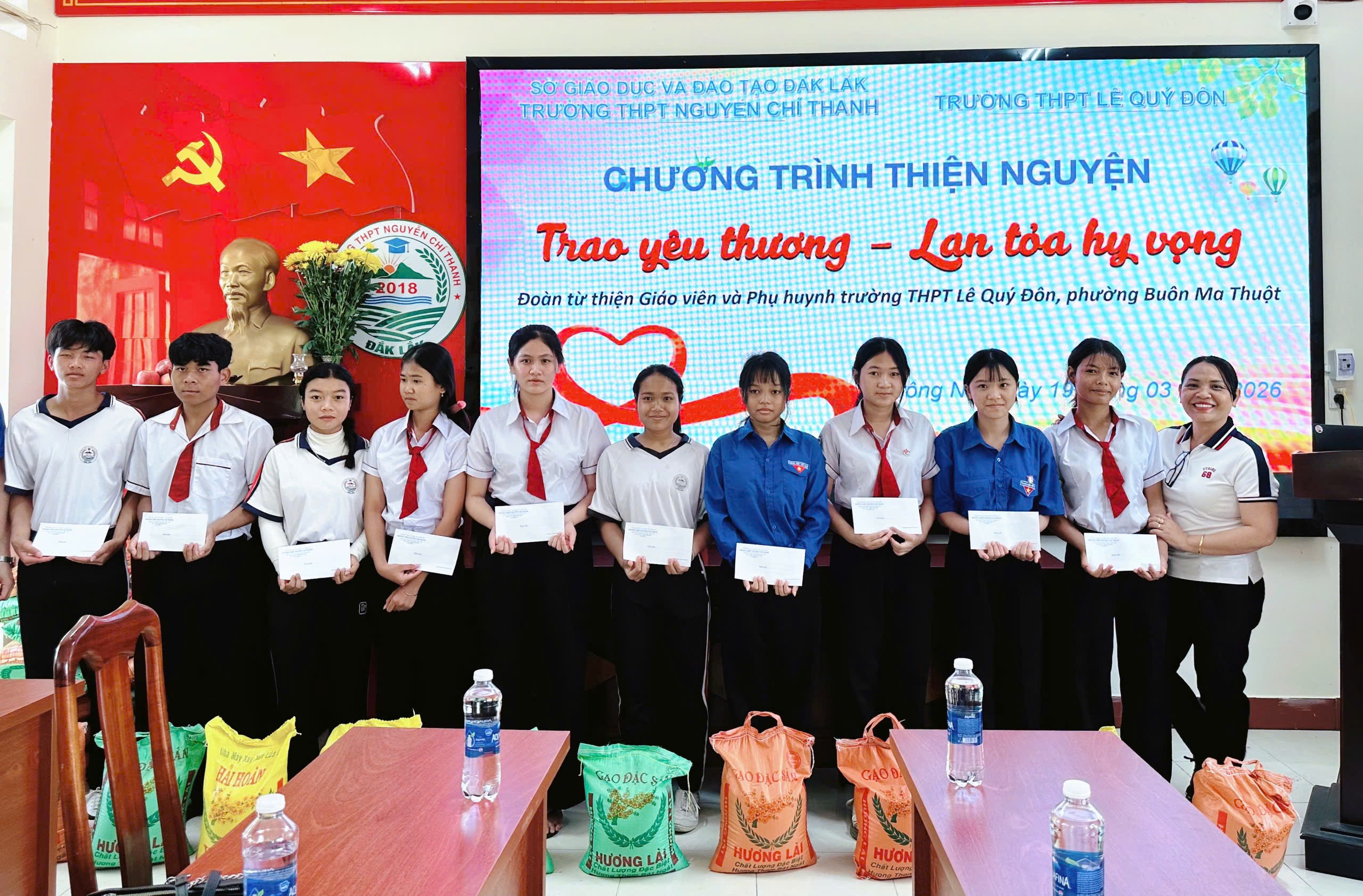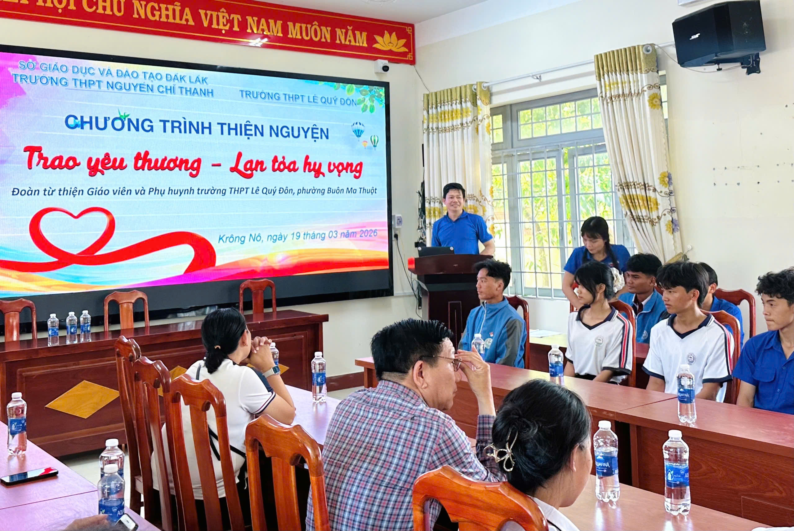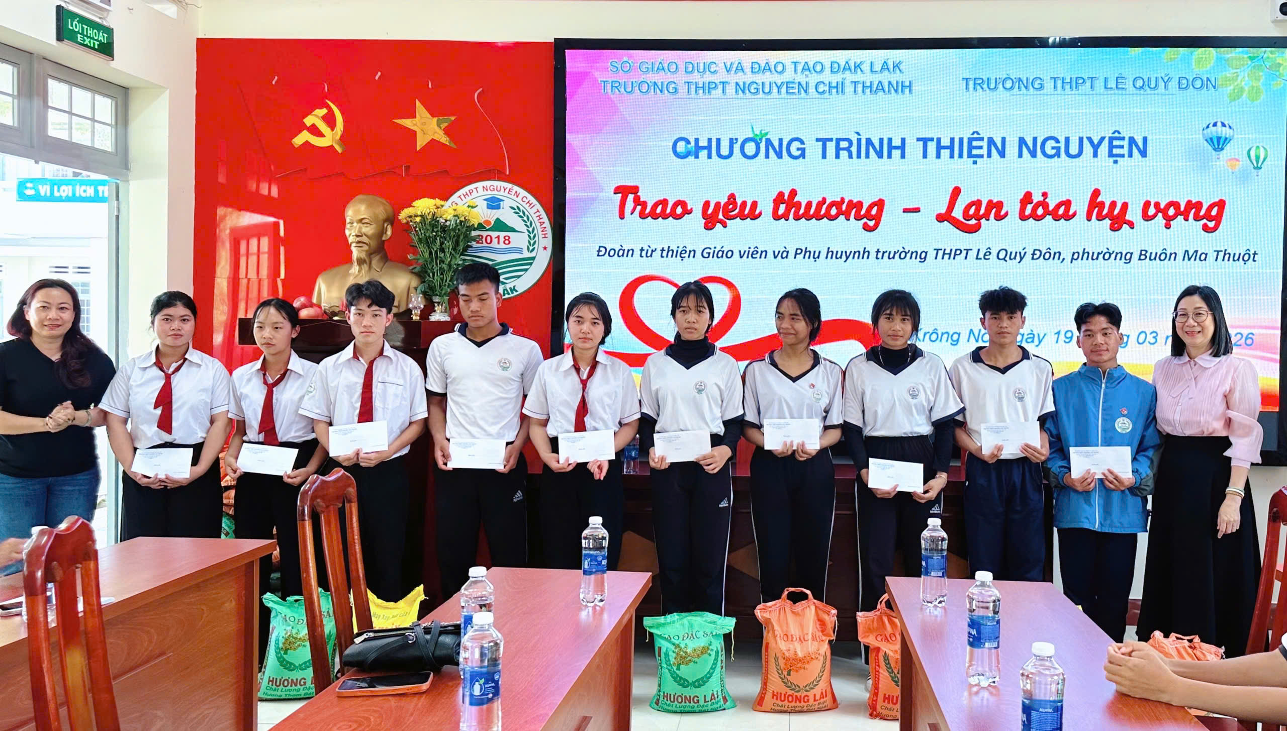 Chiều ngày 20/03/2026, Trường THPT Nguyễn Chí Thanh đã tổ chức Lễ trao quà thiện nguyện trong không khí ấm áp và đầy nghĩa tình, với sự tham gia của Đoàn Giáo viên và Phụ huynh Trường THPT Lê Quý Đôn (TP. Buôn Ma Thuột), nhằm sẻ chia khó khăn và tiếp thêm động lực cho các em học sinh trên hành trình học tập.