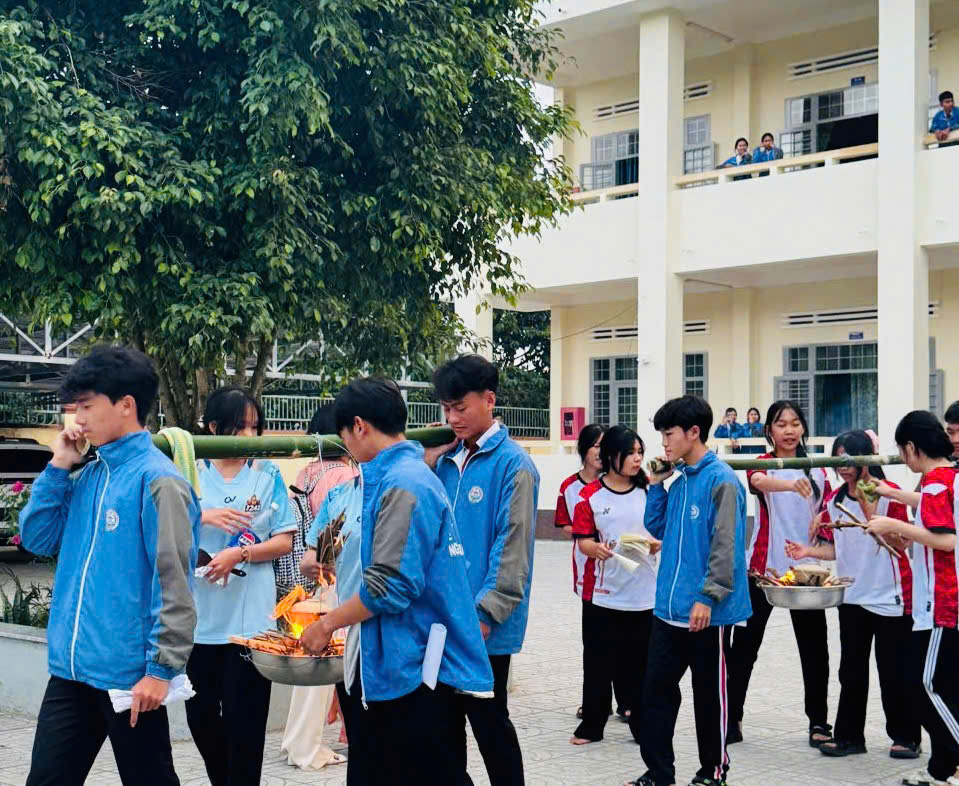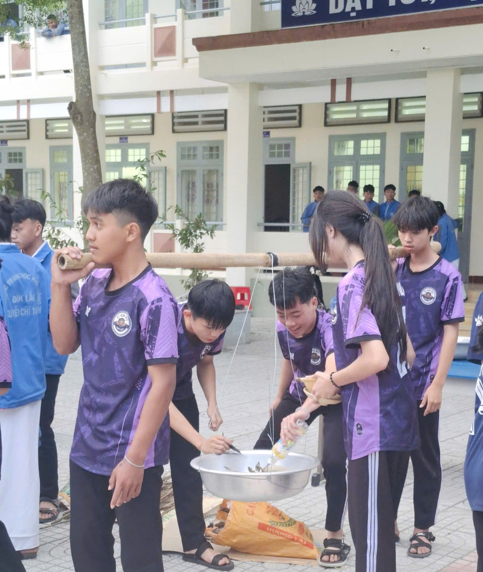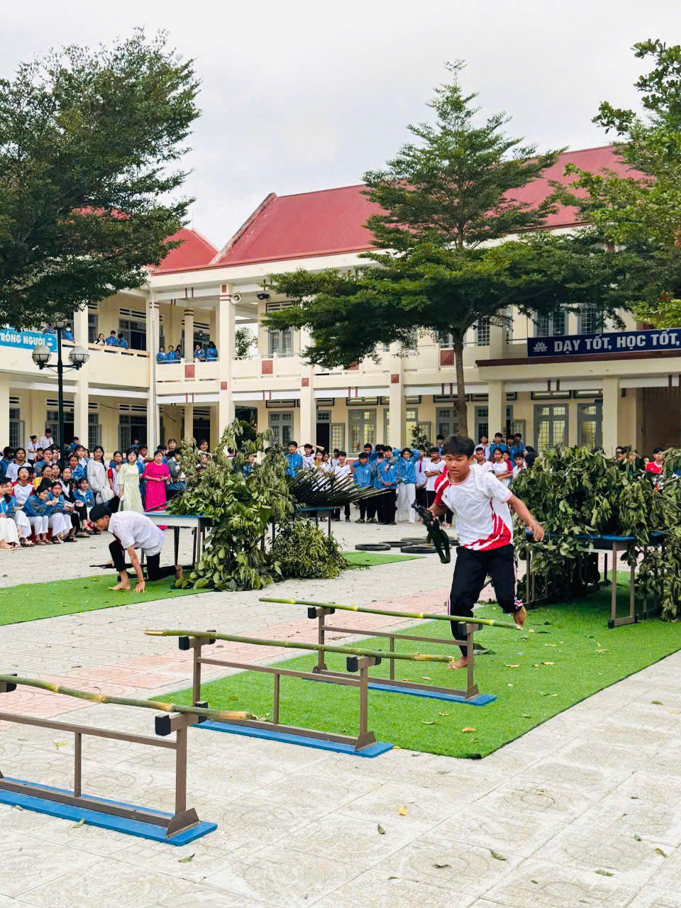 Phần hoạt động trải nghiệm diễn ra sôi nổi với trò chơi hành quân vượt chướng ngại vật, mô phỏng nội dung huấn luyện quân sự. Đây là cơ hội tuyệt vời để rèn luyện thể lực, tinh thần kỷ luật, sự nhanh nhẹn và khả năng phối hợp đồng đội cho học sinh. Đặc biệt, trò chơi “nấu cơm Trường Sơn” đã để lại ấn tượng sâu sắc. Khi tái hiện cuộc sống chiến đấu gian khổ của bộ đội ta trong kháng chiến, hoạt động này giúp học sinh trân trọng những hy sinh to lớn của các thế hệ cha anh và giá trị của hòa bình ngày nay.