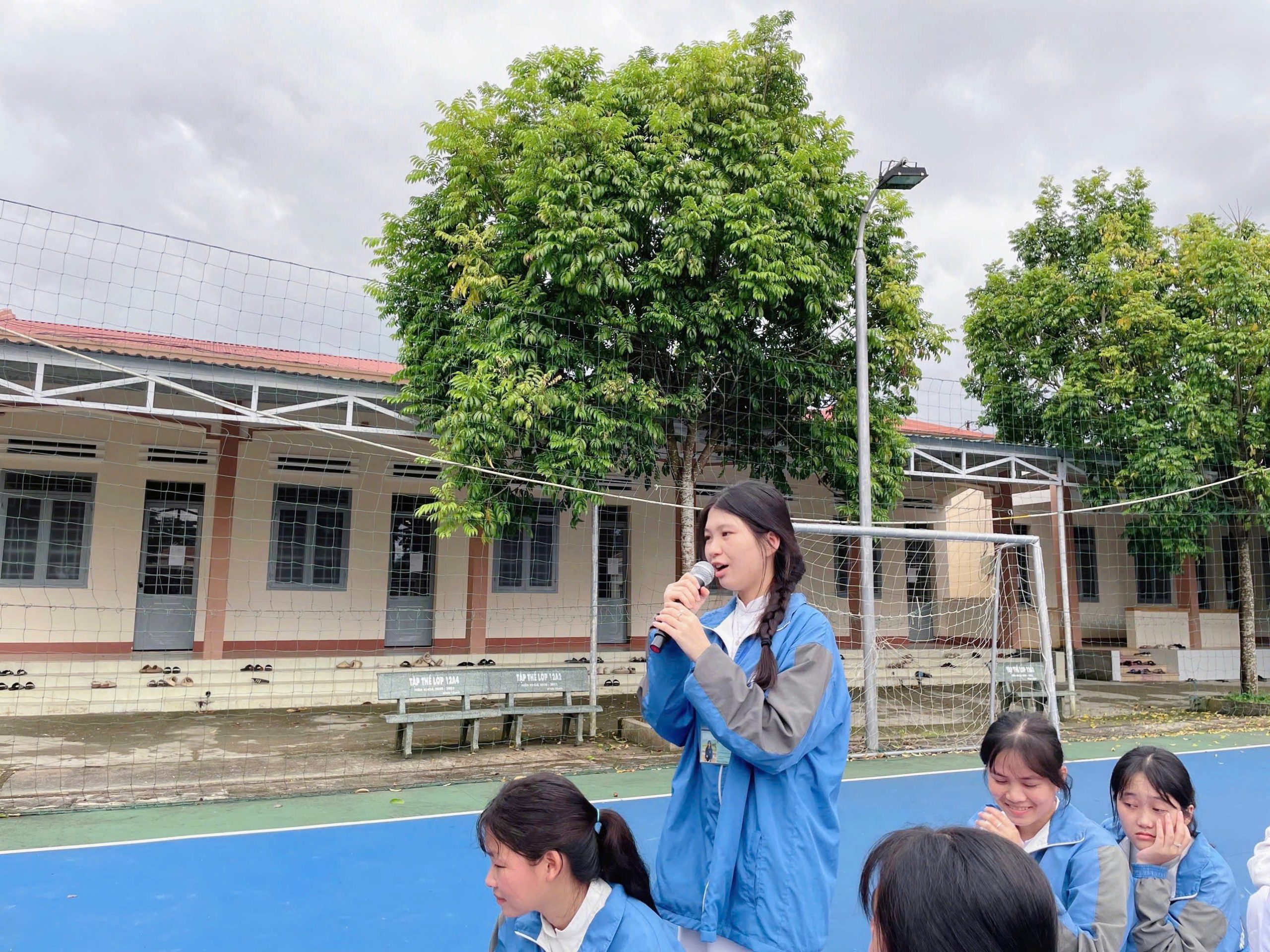 Không kém phần hấp dẫn và thu hút khi tại sân TDTT của nhà trường, Cô Nguyễn Thị Ái Vân – GV bộ môn Vật lí đã phối hợp với cô Trịnh Thị Tuyết Lan – GV bộ môn Toán học tổ chức SHDC cho các em học sinh Khối 12 với chủ đề “Mái trường thân yêu”.