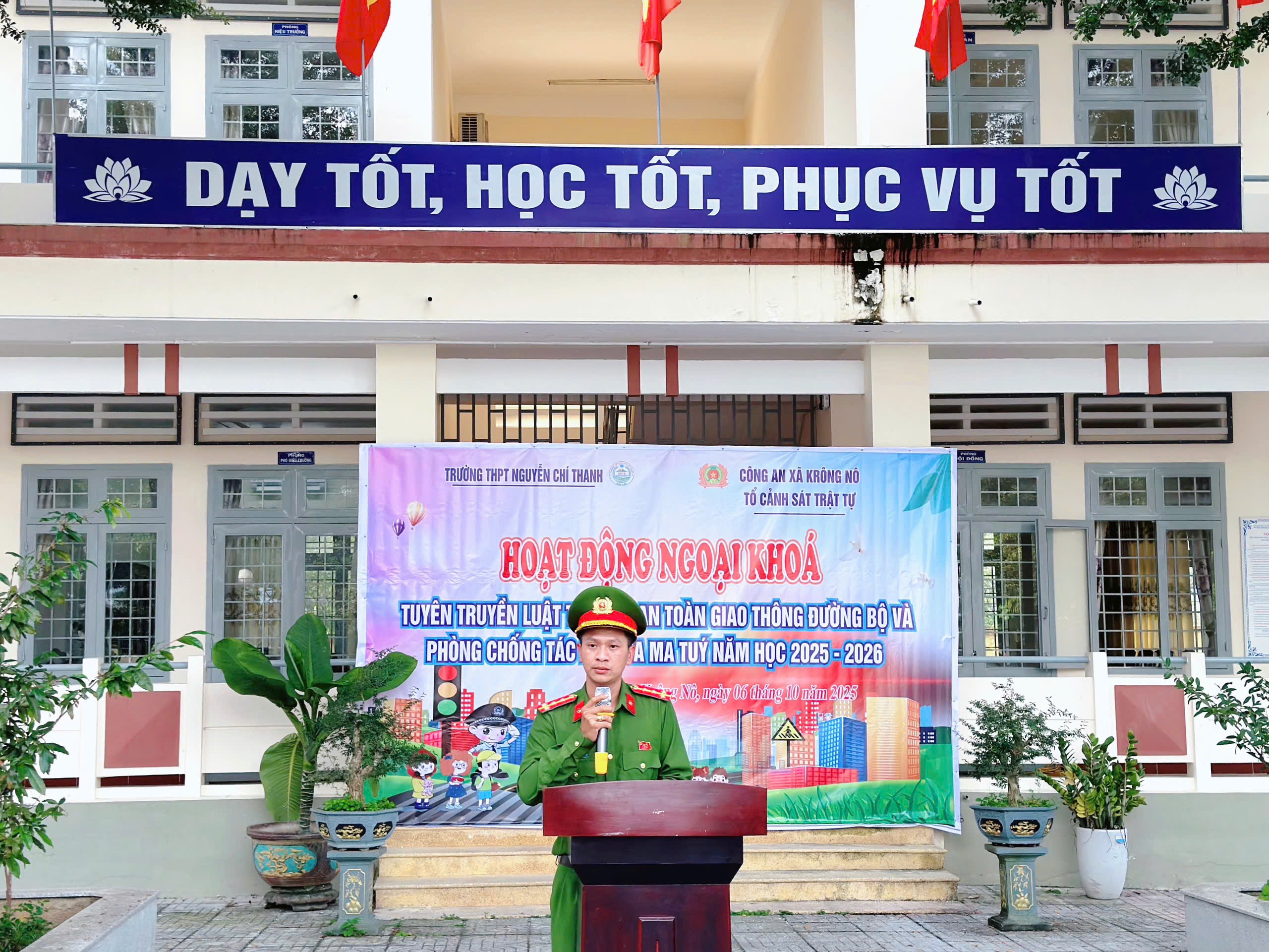 Chiều ngày 06/10/2025, trong giờ sinh hoạt dưới cờ tuần 05, được sự cho phép của Chi bộ và Ban Giám hiệu nhà trường, Công an xã Krông Nô phối hợp cùng Đoàn trường THPT Nguyễn Chí Thanh đã tổ chức thành công buổi ngoại khóa tuyên truyền “Luật trật tự, an toàn giao thông đường bộ và phòng, chống tác hại của ma túy” với sự tham gia của hơn 500 học sinh, cán bộ, giáo viên và nhân viên trong toàn trường.