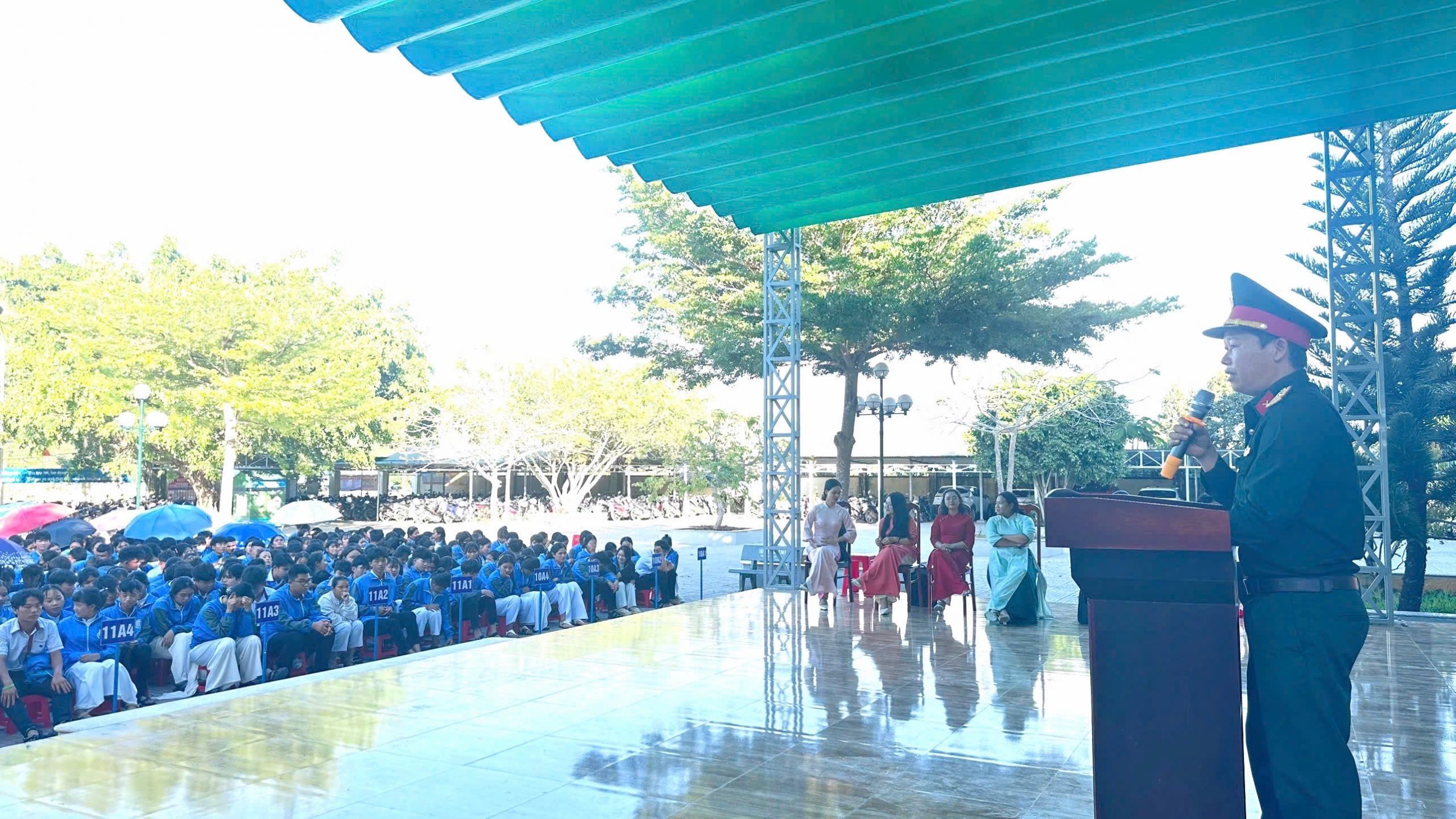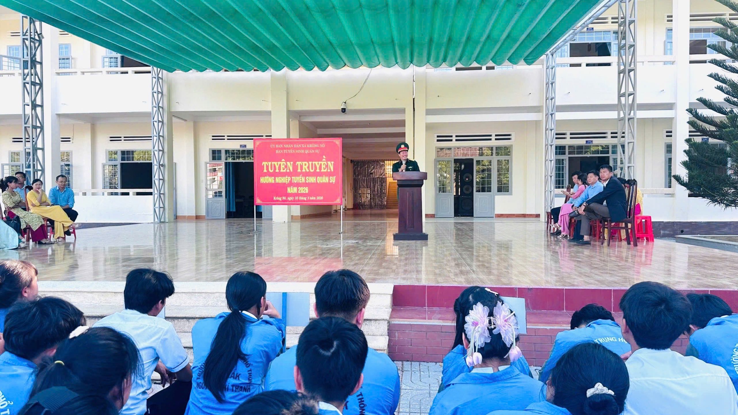 Chiều ngày 16/3/2026, trong giờ chào cờ tuần 26, Ban Chỉ huy Quân sự xã Krông Nô đã phối hợp với Trường THPT Nguyễn Chí Thanh tổ chức tuyên truyền, hướng nghiệp tuyển sinh quân sự năm 2026 cho cán bộ, giáo viên và các em học sinh trong trường.