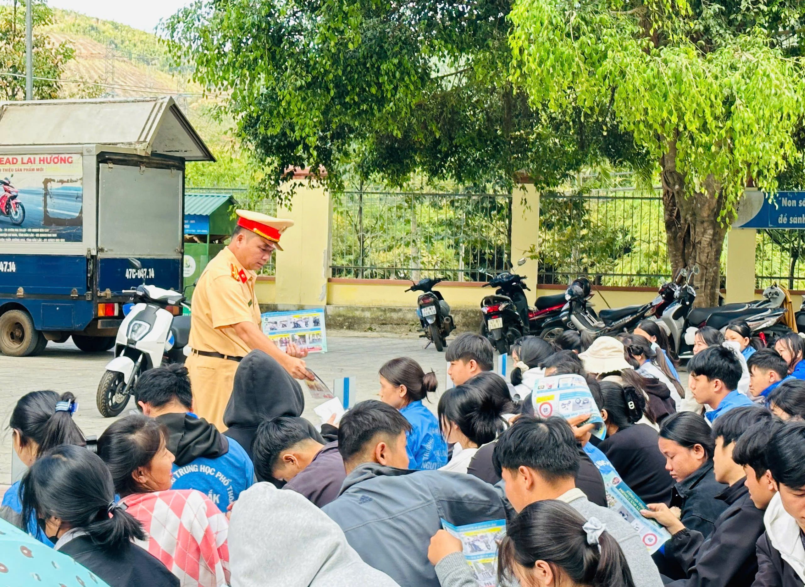 Tại buổi tuyên truyền, cán bộ chiến sĩ CSGT đã cung cấp cho các em học sinh cái nhìn tổng quan về tình hình trật tự, an toàn giao thông trên địa bàn tỉnh nói chung và khu vực nhà trường – có tuyến Quốc lộ 27 đi qua nói riêng. Đồng thời chỉ ra những lỗi vi phạm phổ biến mà người tham gia giao thông thường mắc phải, như: không đội mũ bảo hiểm khi điều khiển mô tô, xe gắn máy, đi ngược chiều, vượt đèn đỏ, chạy quá tốc độ quy định, sử dụng nồng độ cồn, phóng nhanh, lạng lách, đánh võng… Đây đều là những hành vi tiềm ẩn nguy cơ gây tai nạn nghiêm trọng, không chỉ ảnh hưởng đến tính mạng, tài sản của bản thân người vi phạm mà còn đe dọa sự an toàn của cộng đồng.