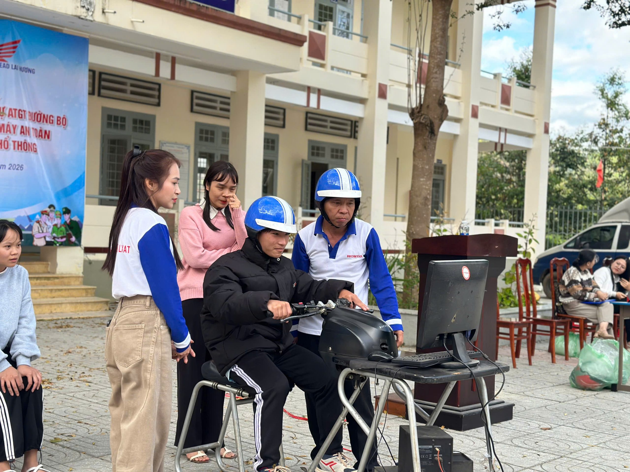 Học sinh được thực hành các kỹ năng lái xe an toàn, đội mũ bảo hiểm đúng cách
