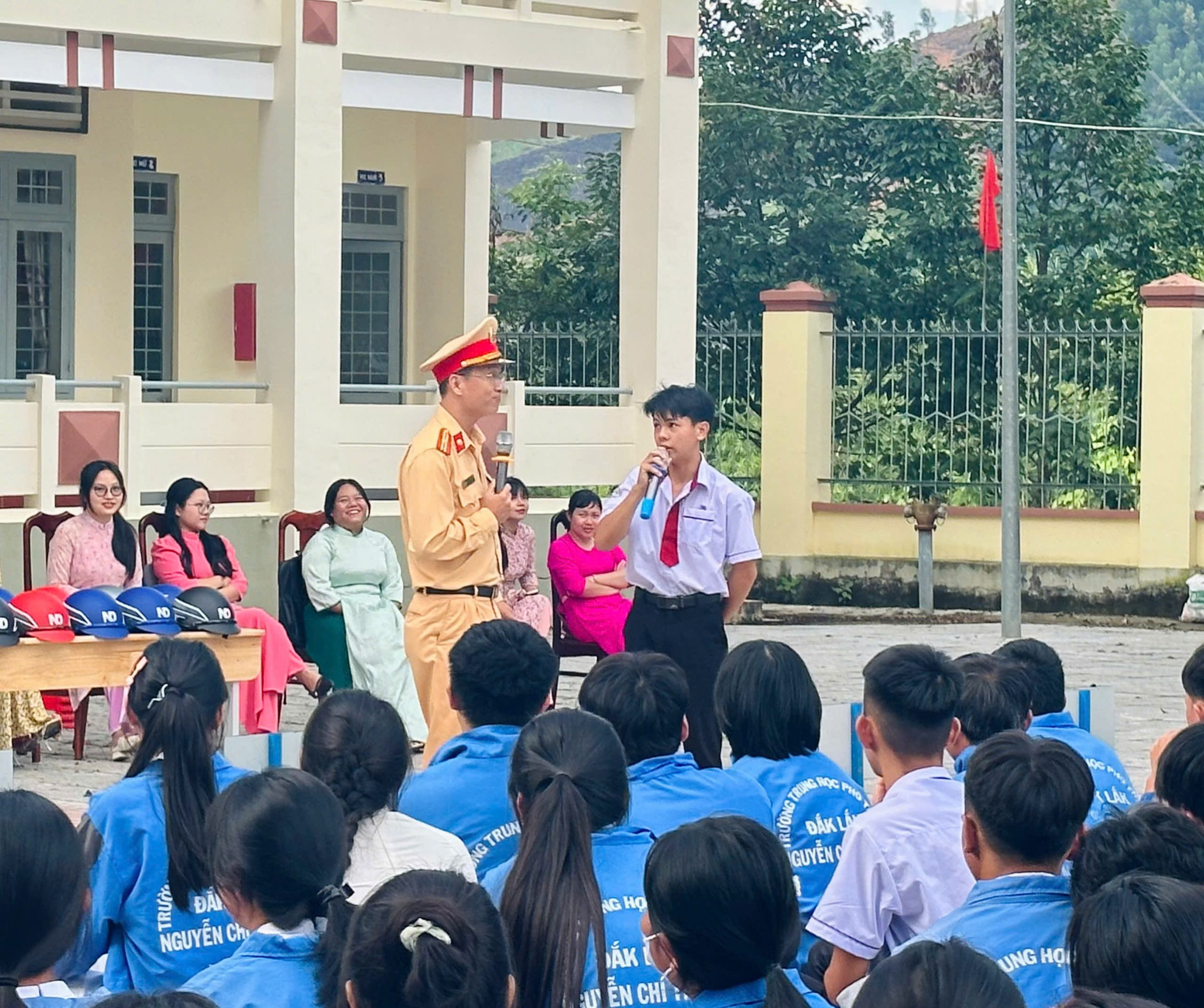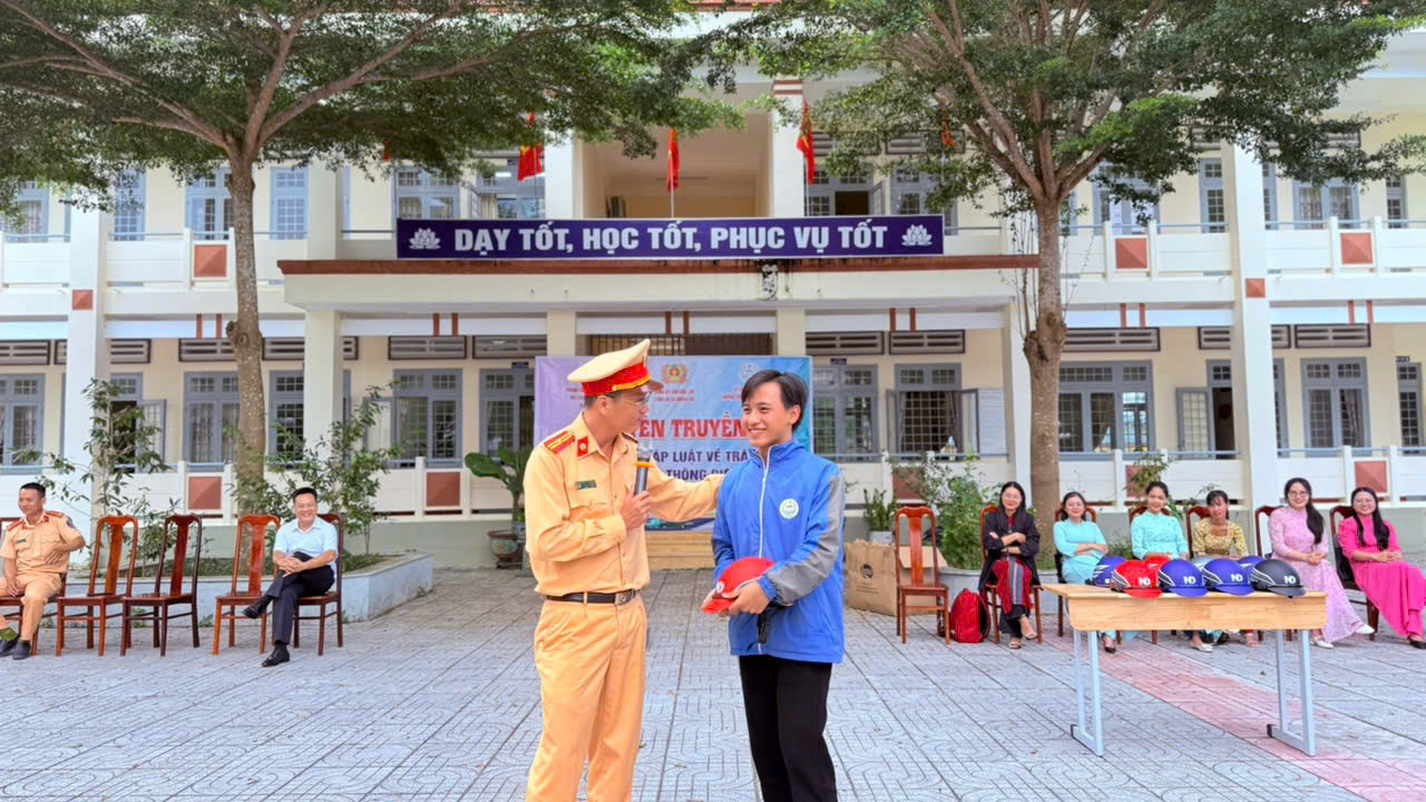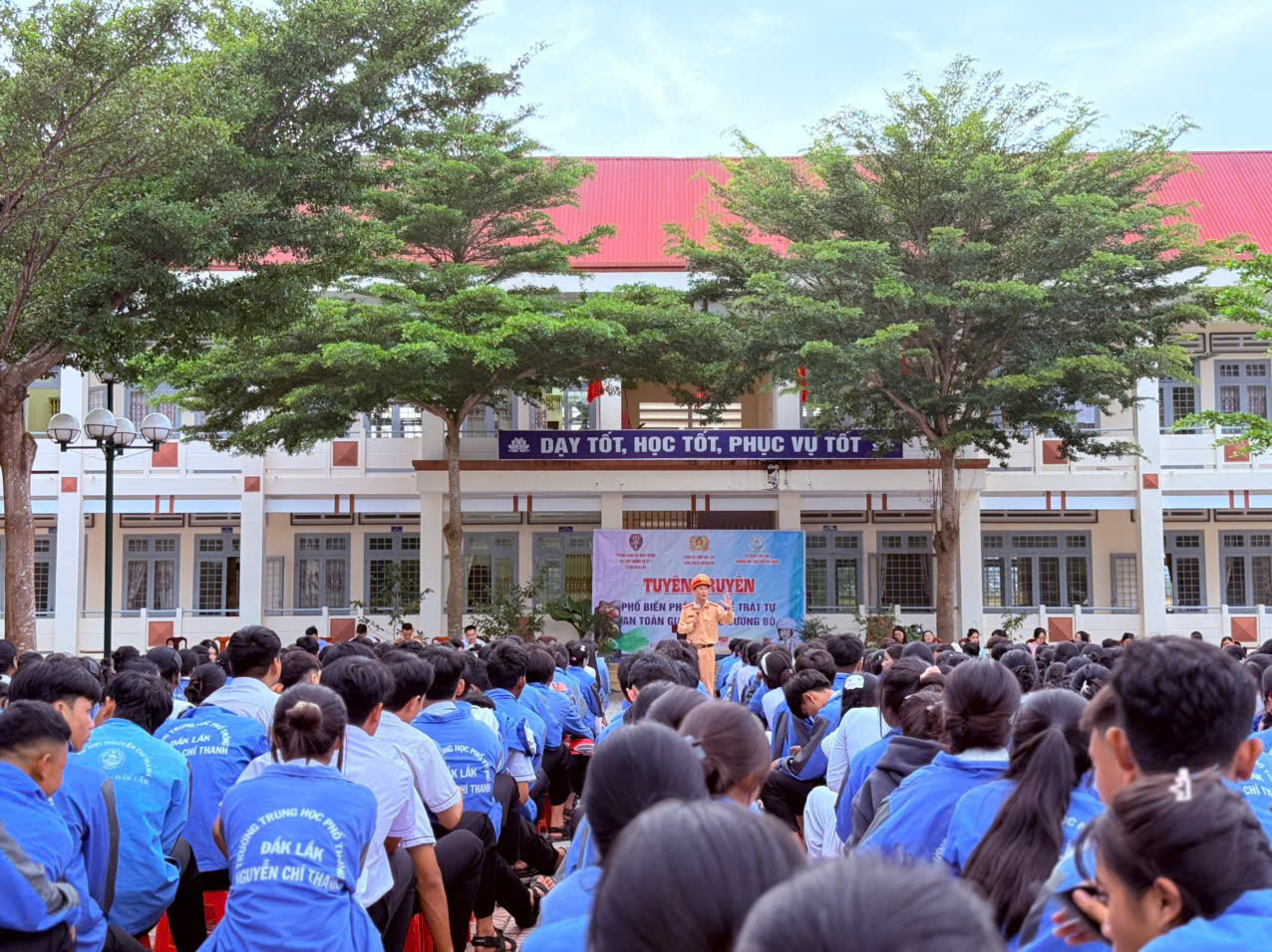 Thực hiện Chương trình phối hợp số 11/CTrPH-BCA-BGDĐT giữa Bộ Công an với Bộ Giáo dục và Đào tạo về tăng cường công tác tuyên truyền, phổ biến, giáo dục pháp luật về trật tự an toàn giao thông trong các cơ sở giáo dục giai đoạn 2022-2025; Kế hoạch số 954/KH- PC08 ngày 31/3/2025 của Phòng Cảnh sát giao thông, Công an tỉnh Đắk Lắk về tuyên truyền, phổ biến pháp luật, vân động quần chúng nhân dân tham gia đảm bảo trật tự an toàn giao thông năm 2025. Chiều ngày 10/11/2025 Tổ địa bàn Lắk, Đội Cảnh sát giao thông đường bộ số 1 thuộc Phòng Cảnh sát giao thông Công an Tỉnh Đắk Lắk đã tổ chức tuyên truyền, phổ biến pháp luật về TTATGT đường bộ cho 39 giáo viên, công nhân viên và hơn 500 em học sinh của nhà trường.
