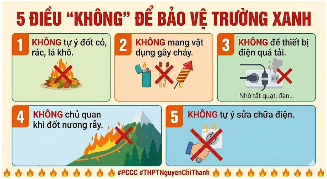 1️⃣ KHÔNG tự ý đốt cỏ, rác, lá khô trong khuôn viên trường và khu vực giáp ranh nương rẫy. Một đốm lửa nhỏ gặp gió đại ngàn có thể trở thành thảm họa!